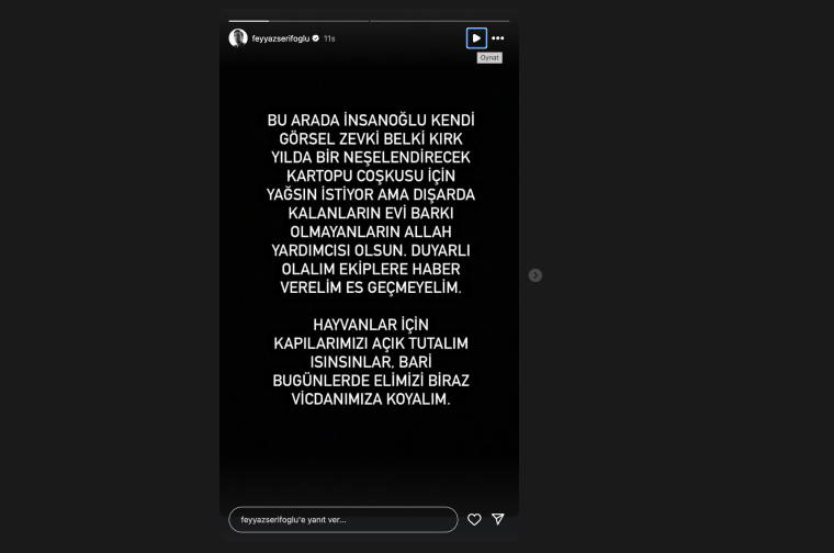 "İnsanoğlu, belki kırk yılda bir neşelenmek için kartopu coşkusu yaşamak istiyor ama dışarıda kalanların, evi barkı olmayanların Allah yardımcısı olsun. Duyarlı olalım, ekiplere haber verelim, es geçmeyelim. Hayvanlar için kapılarımızı açık tutalım, ısınsınlar. Bari bugünlerde elimizi biraz vicdanımıza koyalım."