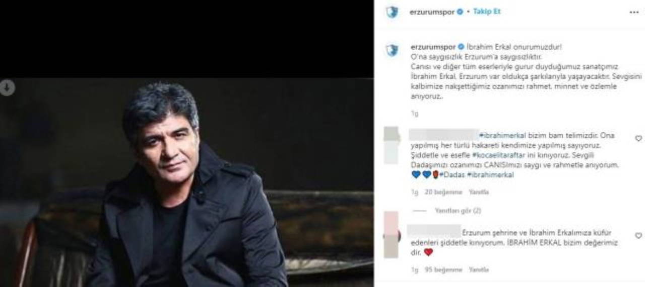 Erzurumspor'da Twitter hesaplarından "İbrahim Erkal onurumuzdur! O'na saygısızlık Erzurum'a saygısızlıktır. Canısı ve diğer tüm eserleriyle gurur duyduğumuz sanatçımız İbrahim Erkal, Erzurum var oldukça şarkılarıyla yaşayacaktır. Sevgisini kalbimize nakşettiğimiz ozanımızı rahmet, minnet ve özlemle anıyoruz" diye yazdı.