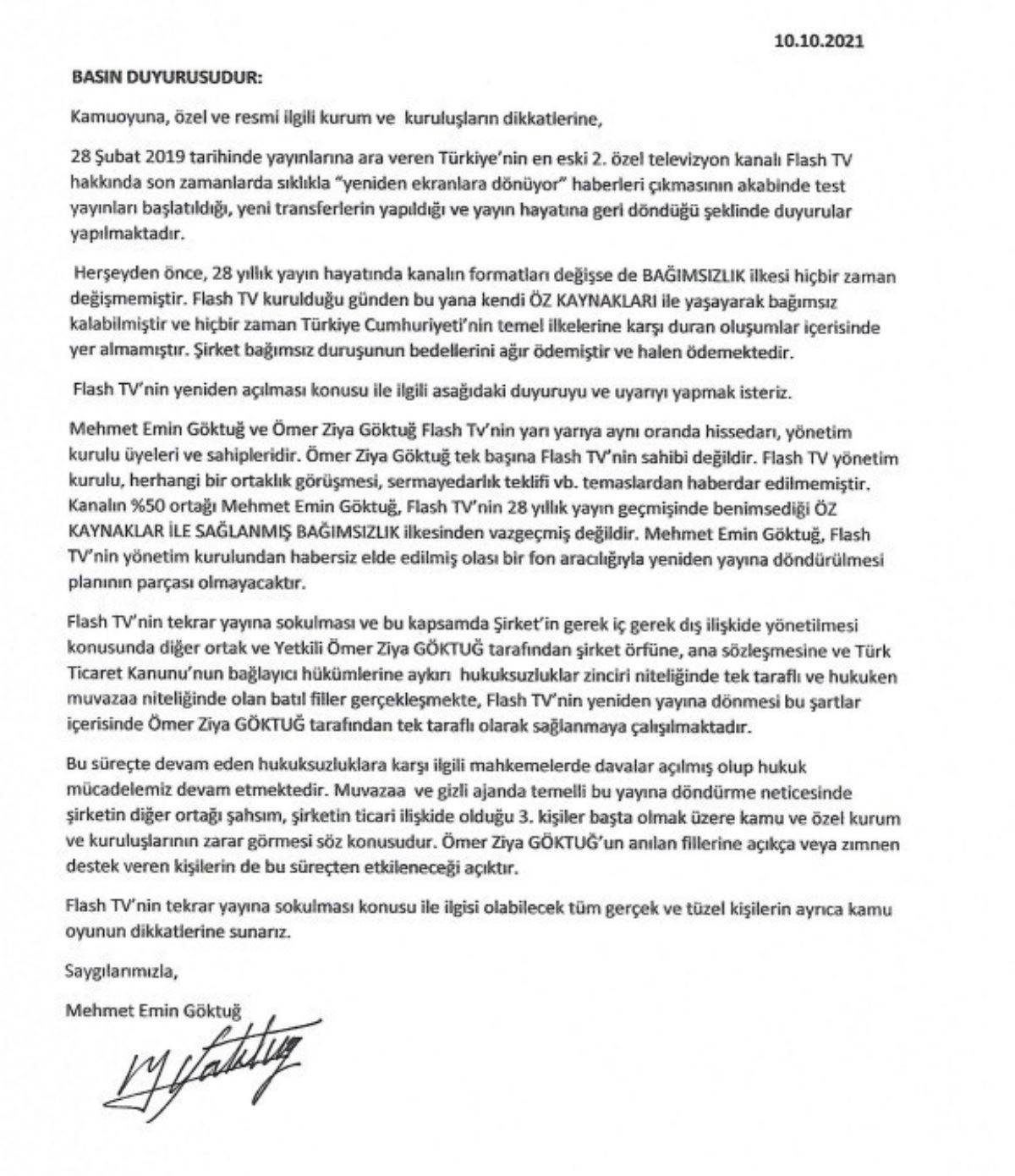 Göktuğ, açıklamasında, 'yönetim kurulundan habersiz elde edilmiş fon' ifadelerini kullandı, "Muvazaa ve gizli ajanda temelli bu yayına döndürme neticesinde şirketin diğer ortağı şahsım, şirketin ticari ilişkide olduğu 3. kişiler başta olmak üzere kamu ve özel kurum ve kuruluşlarının zarar görmesi söz konusudur" dedi.