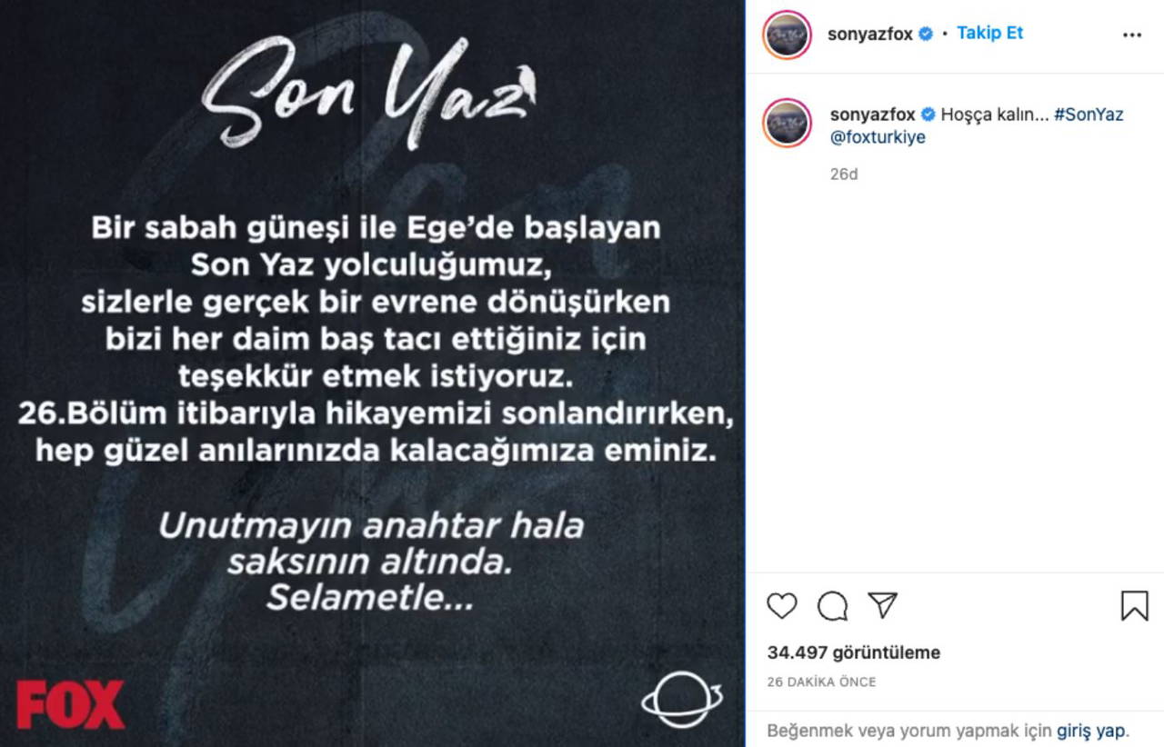 Dizi ekibine final kararı iletilirken sosyal medyada yapılan paylaşımda “Bir sabah güneşi ile Ege’de başlayan Son Yaz yolculuğumuz, sizlerle gerçek bir evrene dönüşürken bizi her daim baş tacı ettiğiniz için teşekkür etmek istiyoruz. 26. bölüm itibarıyla hikayemizi sonlandırırken, hep güzel anılarınızda kalacağımıza eminiz. Unutmayın anahtar hala saksının altında. Selametle...” ifadelerine yer verildi.