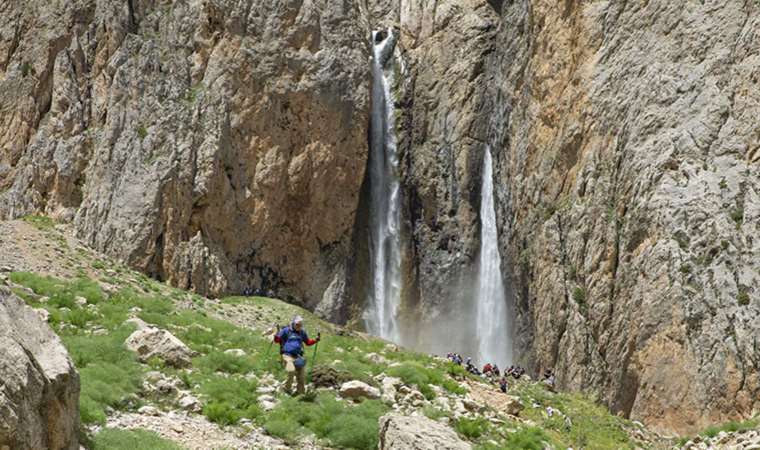 Rotaları boyunca zorlu patikalardan geçen doğa ve fotoğraf tutkunları, yaklaşık 3 saatlik seyahatin ardından şelalelerin bulunduğu alana ulaşıyor.
