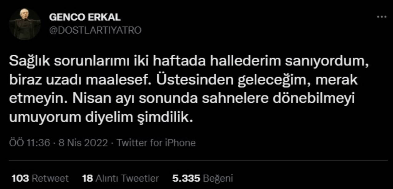 Tiyatro sanatçısı Genco Erkal, mart ayında, Twitter