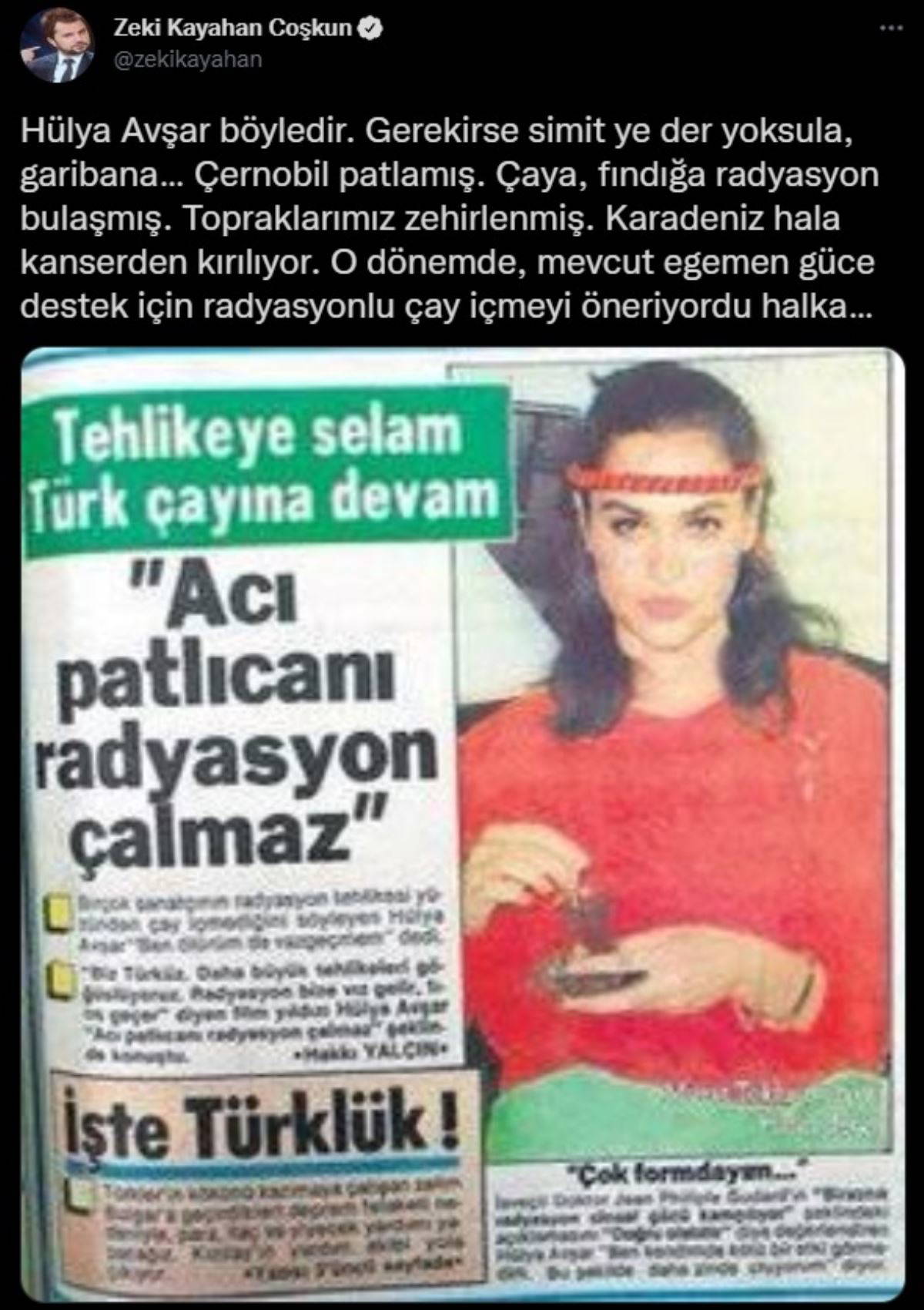 Avşar'ın 'radyasyonlu çay' önerdiği bir haberi hatırlatan Coşkun, "Hülya Avşar böyledir... O dönemde, mevcut egemen güce destek için radyasyonlu çay içmeyi öneriyordu halka" ifadelerini kullandı. Coşkun'un paylaşımı kısa sürede binlerce beğeni ve yorum aldı.