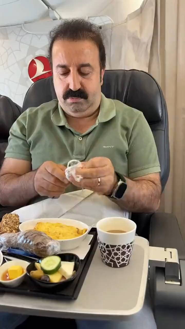 Uçuş esnasında yemek servisinin yapılmasının ardından Sur, bu sırada tişörtünün içinden çıkardığı şırdanı yedi.
