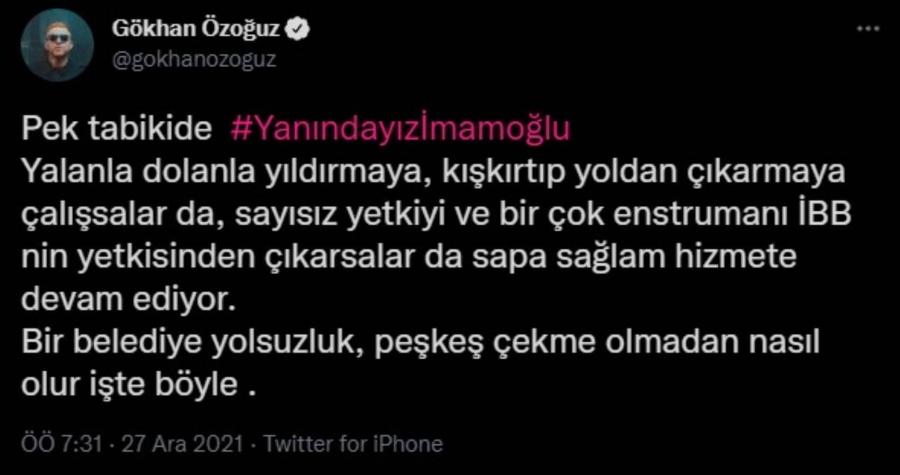 İçişleri Bakanlığı'nın terör örgütleriyle iltisaklı kişilerin işe alındığı iddiası nedeniyle İBB hakkında başlattığı 'özel teftişe' tepkiler sürüyor. Son olarak sosyal medya hesabından bir paylaşım yapan Athena grubunun solisti Gökhan Özoğuz, "Pek tabii ki de Yanındayız İmamoğlu. Yalanla dolanla yıldırmaya, kışkırtıp yoldan çıkarmaya çalışsalar da" ifadeleri ile İBB Başkanı İmamoğlu'na destek verdi.