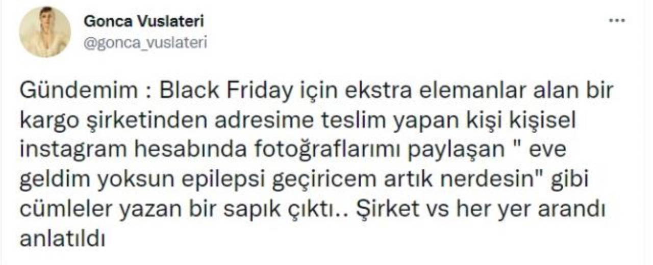 Oyuncu Gonca Vuslateri, Black Friday indirimlerinde yoğunlaşan çevrim içi satış taleplerine yetişebilmek için geçici olarak kargo şirketine işe giren bir erkeğin sosyal medyadan tacizine uğradığını ifade etti.