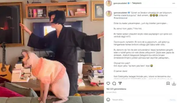 Son olarak, sosyal medyada oldukça yayılan bu şarkıya Gonca Vuslateri de kayıtsız kalamadı. Eğlenceli halleriyle tanınan oyuncu, Cübbeli'nin sözlerinden yapılan şarkıda dans etti. Oyuncu o hallerini de 1 milyon takipçisinin bulunduğu Instagram hesabından paylaştı.