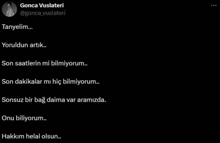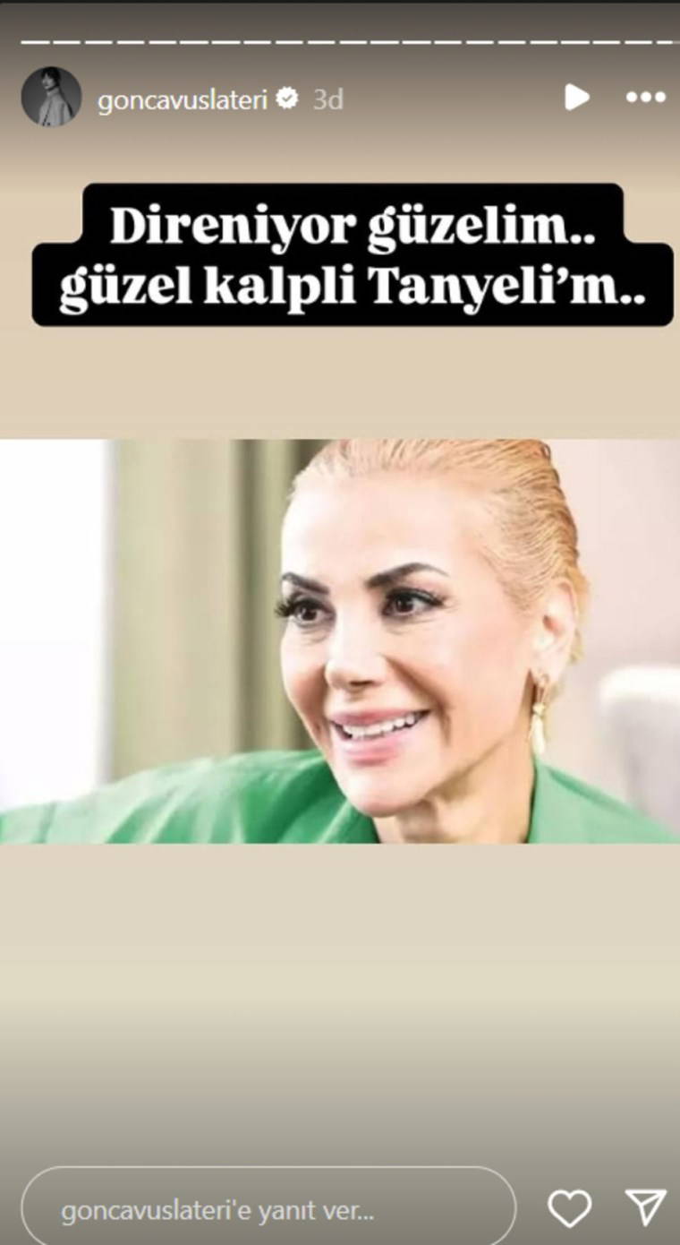 Sanatçının direncini vurgulayan Vuslateri, bir başka paylaşımında ise "Direniyor güzelim. Güzel kalpli Tanyeli'm" ifadelerini kullandı.
