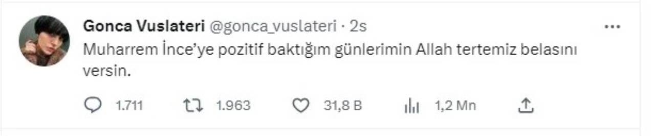 İnce'nin Erdoğan'ın işini kolaylaştırdığı iddiası çoğu ünlü isim tarafından dile getirilirken konuya ilişkin bir paylaşım da ünlü oyuncu Gonca Vuslateri'den geldi.