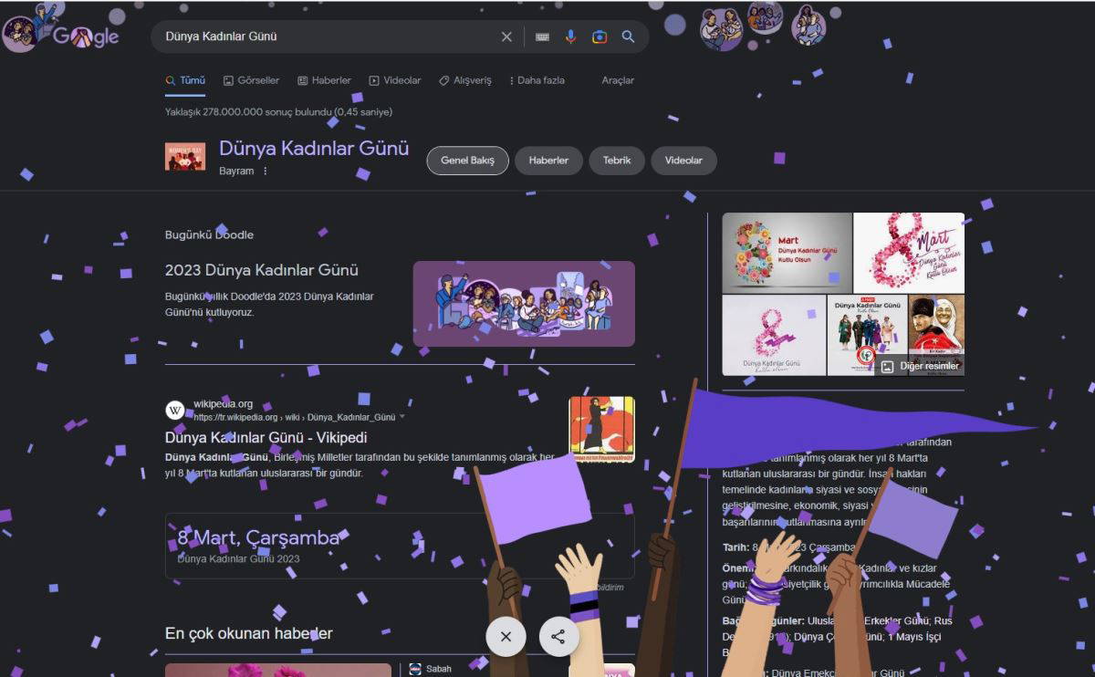 İllüstrasyona tıklandığında ise, kullanıcıları mor renkli konfetiler ve 8 Mart'ın tarihine ilişkin haberler karşılıyor.