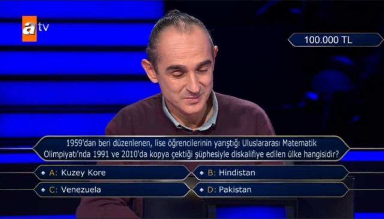 Soru ise "1959'dan beri düzenlenen, lise öğrencilerinin yarıştığı Uluslararası Matematik Olimpiyatı'nda 1991 ve 2010'da kopya çektiği şüphesiyle diskalifiye edilen ülke hangisidir" oldu.