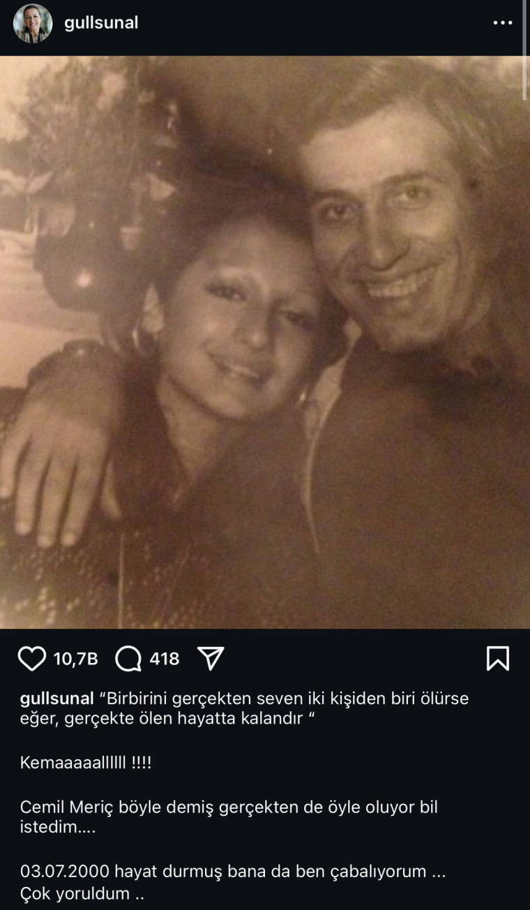 Eşi Kemal Sunal ile yıllar önce çektirdiği bu fotoğrafı yayımlayan Gül Sunal, "Birbirini gerçekten seven iki kişiden biri ölürse eğer, gerçekte ölen hayatta kalandır." Kemal, Cemil Meriç böyle demiş. Gerçekten de öyle oluyor bil istedim. 03.07.2000 hayat durmuş, bana da ben çabalıyorum. Çok yoruldum" ifadelerini kullandı.