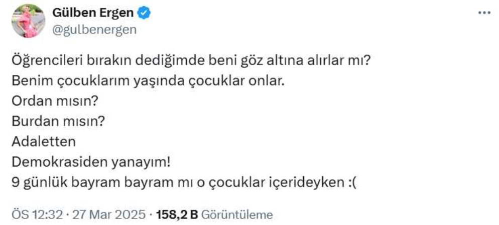 "Öğrencileri bırakın dediğimde beni göz altına alırlar mı? Benim çocuklarım yaşında çocuklar onlar. Ordan mısın? Burdan mısın? Adaletten, demokrasiden yanayım! 9 günlük bayram bayram mı o çocuklar içerideyken :("