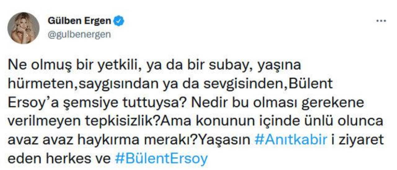 Ergen, Twitter hesabından yaptığı paylaşımda, “Ne olmuş bir yetkili, ya da bir subay, yaşına hürmeten, saygısından ya da sevgisinden Bülent Ersoy’a şemsiye tuttuysa? Nedir bu olması gerekene verilmeyen tepkisizlik? Ama konunun içinde ünlü olunca avaz avaz haykırma merakı? Yaşasın Anıtkabir i ziyaret eden herkes ve Bülent Ersoy” ifadelerini kullandı.