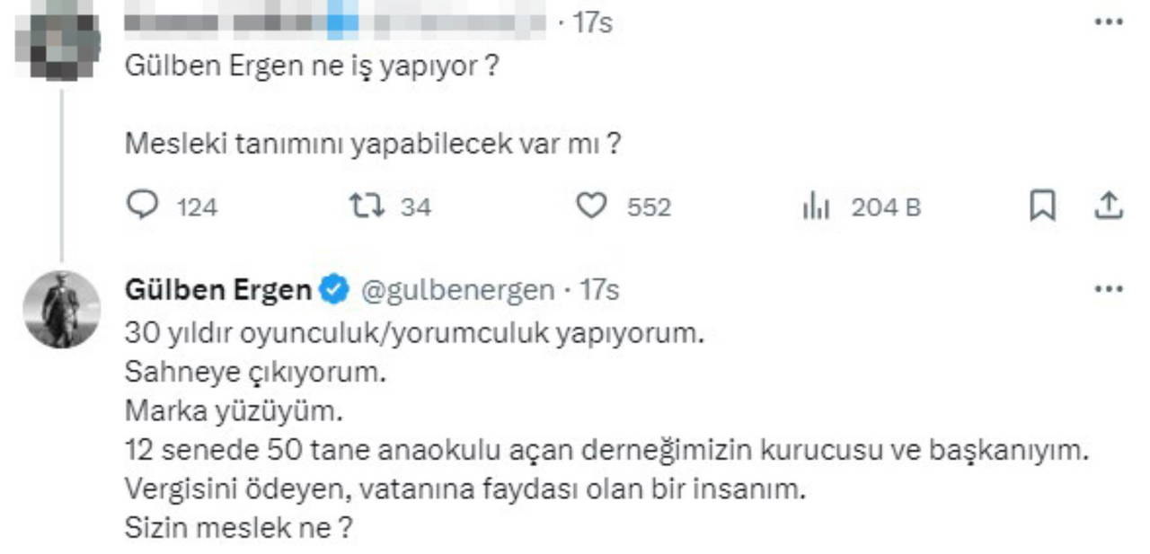 Bir kullanıcının "Gülben Ergen ne iş yapıyor? Mesleki tanımını yapabilecek biri var mı?" sorusunu gören sanatçı, "30 yıldır oyunculuk/yorumculuk yapıyorum. Sahneye çıkıyorum. Marka yüzüyüm. 12 senede 50 tane anaokulu açan derneğimizin kurucusu ve başkanıyım. Vergisini ödeyen, vatanına faydası olan bir insanım. Sizin meslek ne?" yanıtını verdi.