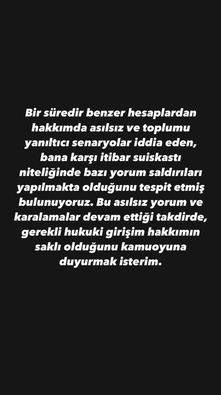 Konuya ilişkin açıklama yapan Ergül, "Bir süredir benzer hesaplardan hakkımda asılsız ve toplumu yanıltıcı senaryolar iddia eden, bana karşı itibar suikastı niteliğinde bazı yorum saldırıları yapılmakta olduğunu tespit etmiş bulunuyoruz. Bu asılsız yorum ve karalamalar devam ettiği takdirde gerekli hukuki girişim hakkımın saklı olduğunu kamuoyuna duyurmak isterim" ifadelerini kullandı.