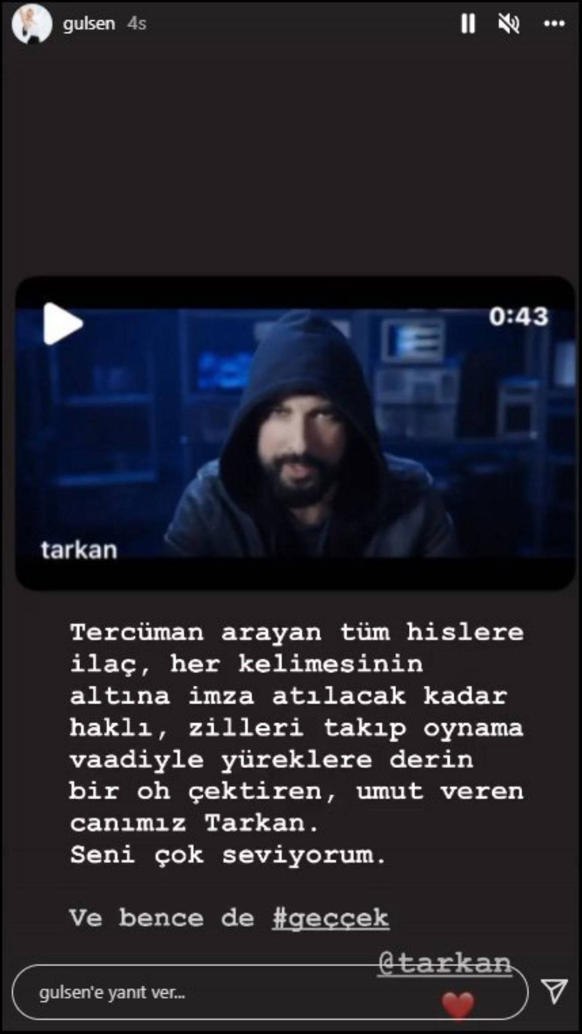 “Tercüman arayan tüm hislere ilaç, her kelimesinin altına imza atılacak kadar haklı, zilleri takıp oynama vaadiyle yüreklere derin bir oh çektiren, umut veren canımız Tarkan. Seni çok seviyorum. Ve bence de geççek.”