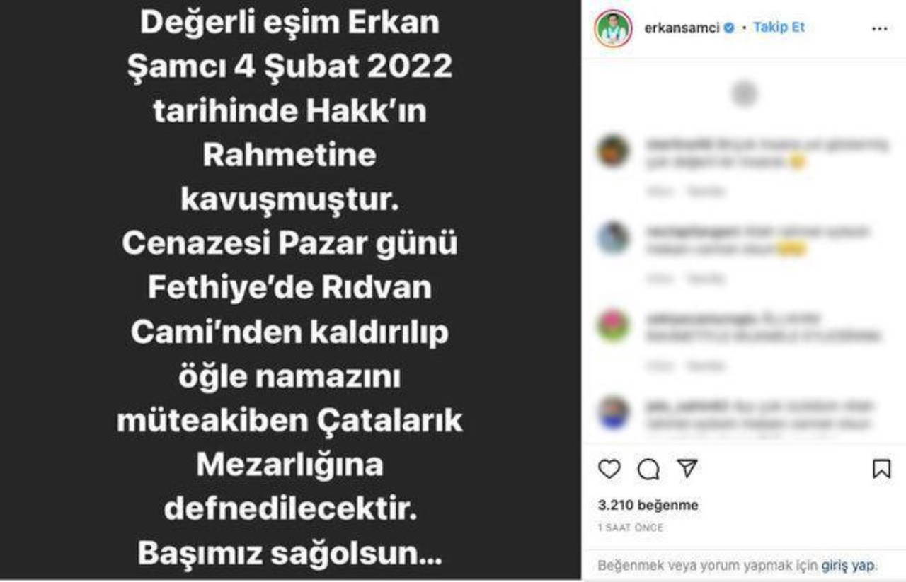 Erkan Şamcı'nın Instagram hesabından paylaşım yapan eşi, "Değerli eşim Erkan Şamcı, 4 Şubat 2022 tarihinde Hakk'ın Rahmetine kavuşmuştur. Cenazesi pazar günü Fethiye'de Rıdvan Camii'nden kaldırılıp öğle namazını müteakiben Çatalarık Mezarlığı'na defnedilecektir. Başımız sağ olsun" ifadelerini kullandı.