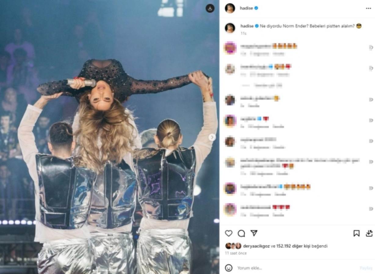 Sahne kostümleri ve şovlarıyla her daim adından söz ettiren Hadise, Instagram hesabından konserinden kareleri yayınlayarak "Ne diyordu Norm Ender? Bebeleri pistten alalım?" notunu yazdı.