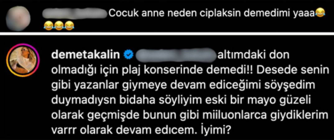 Bunun üzerine bir takipçisinin, "Çocuk, anne neden çıplaksın demedi mi?" yorumuna kayıtsız kalmayan Akalın, sahneye bikiniyle çıkmasının bir sorun oluşturmadığını savundu.