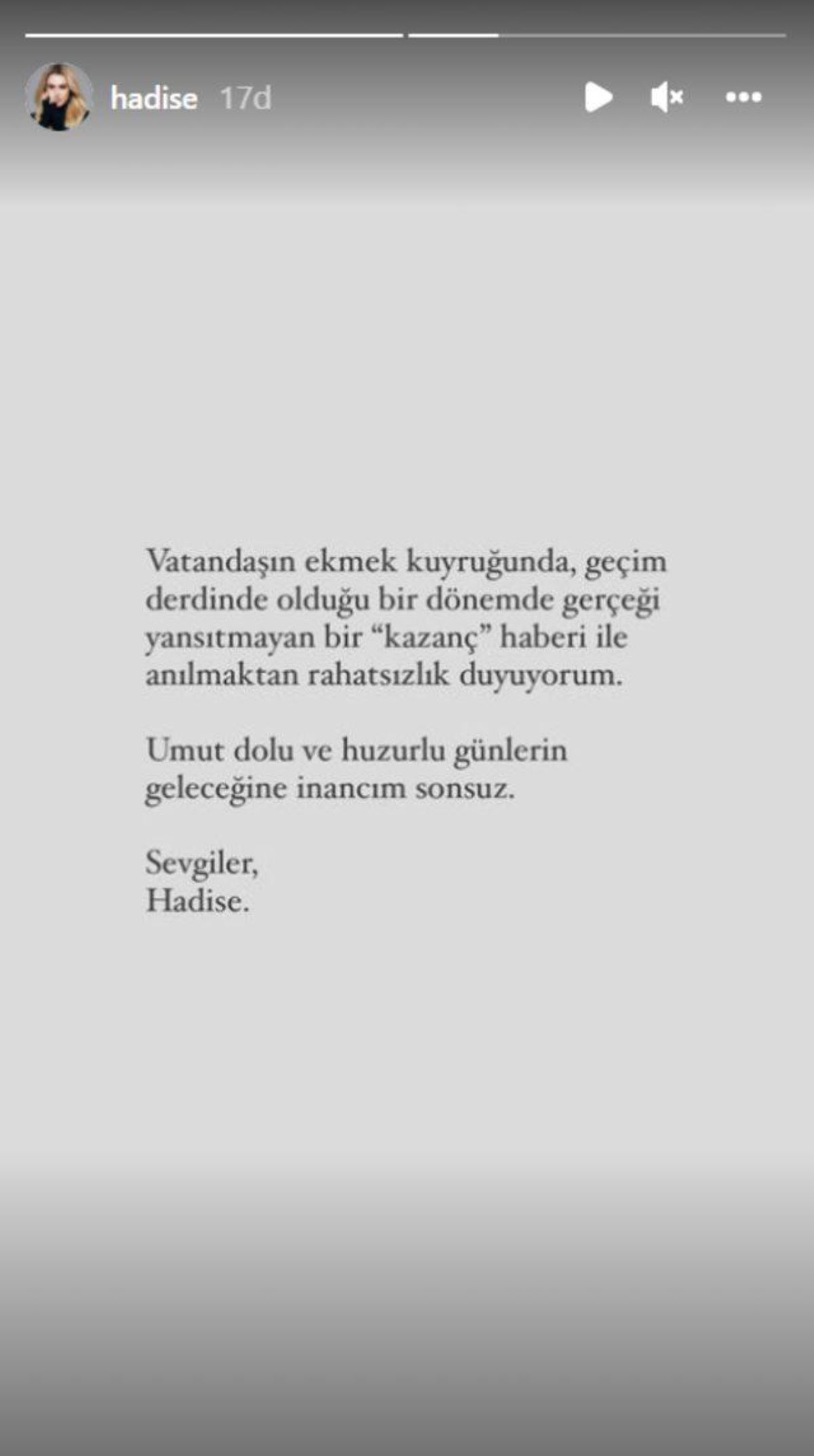 Tepkisini dile getiren şarkıcı, "Vatandaşın ekmek kuyruğunda, geçim derdinde olduğu bir dönemde gerçeği yansıtmayan bir 'kazanç' haberi ile anılmaktan rahatsızlık duyuyorum. Umut dolu ve huzurlu günlerin geleceğine inancım sonsuz. Sevgiler..." ifadelerini kullandı.