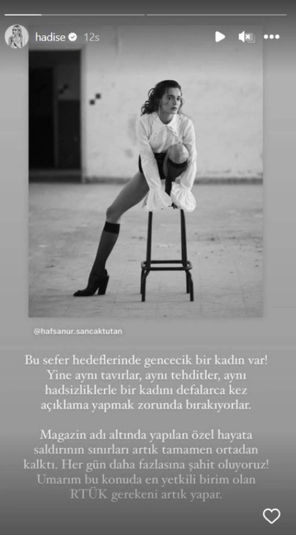 Hadise "Bu sefer hedeflerinde gencecik bir kadın var! Yine aynı tavırlar, aynı tehditler, aynı hadsizlikler bir kadını defalarca kez açıklama yapmak zorunda bırakıyorlar. Magazin adı altında yapılan özel hayata saldırının sınırları tamamen ortadan kalktı. Her gün daha fazlasına şahit oluyoruz! Umarım bu konuda en yetkili birim olan RTÜK gerekeni artık yapar" dedi.
