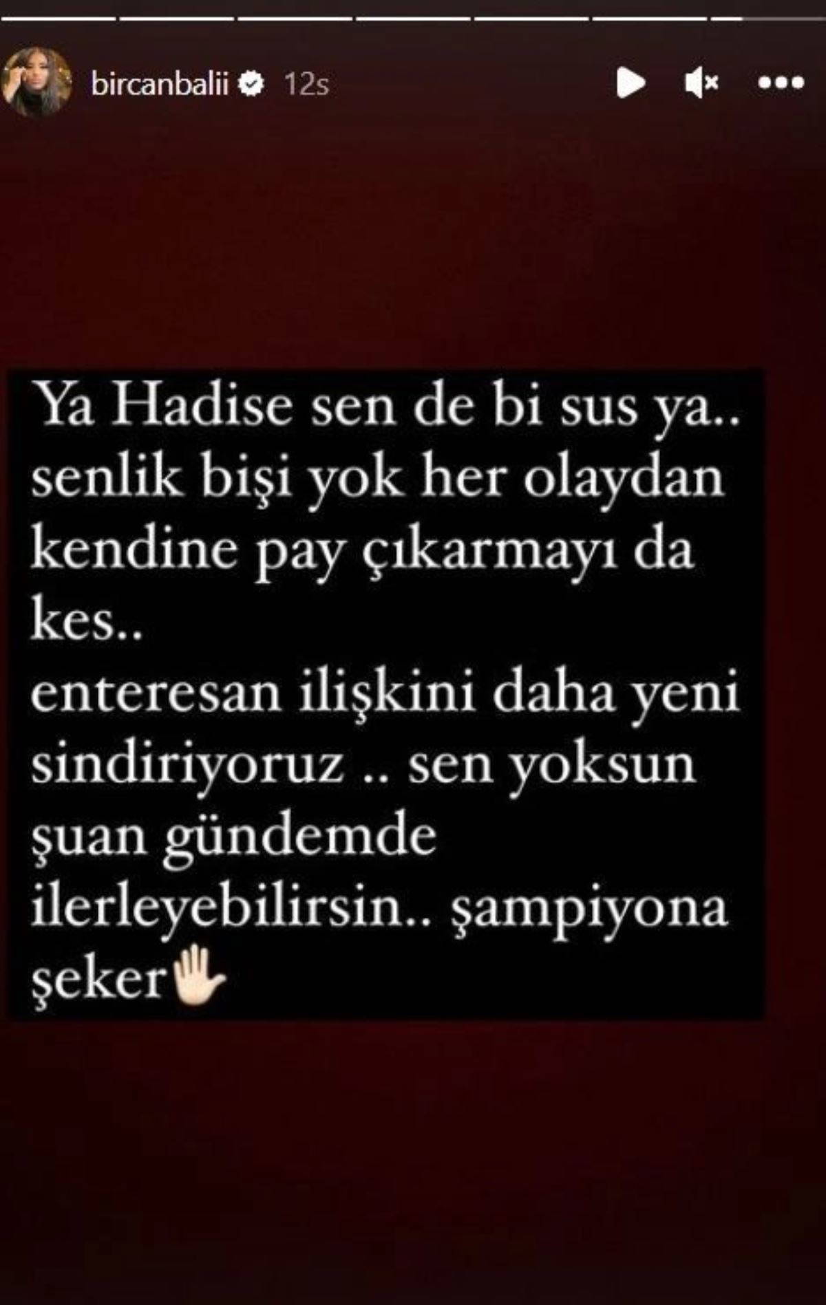 Bunun üzerine Bircan Bali ise Hadise'ye sinirlenip bu mesajı paylaştı.