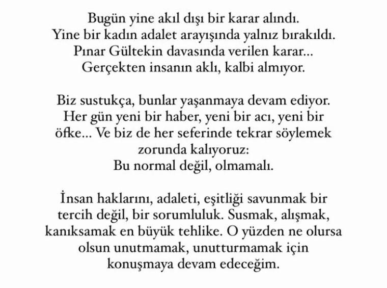 "Bugün yine akıl dışı bir karar alındı. Yine bir kadın, adalet arayışında yalnız bırakıldı. Pınar Gültekin davasında verilen karar... Gerçekten insanın aklı, kalbi almıyor. Biz sustukça, bunlar yaşanmaya devam ediyor. Her gün yeni bir haber, yeni bir acı, yeni bir öfke... Ve biz de her seferinde tekrar söylemek zorunda kalıyoruz; bu normal değil, olmamalı."