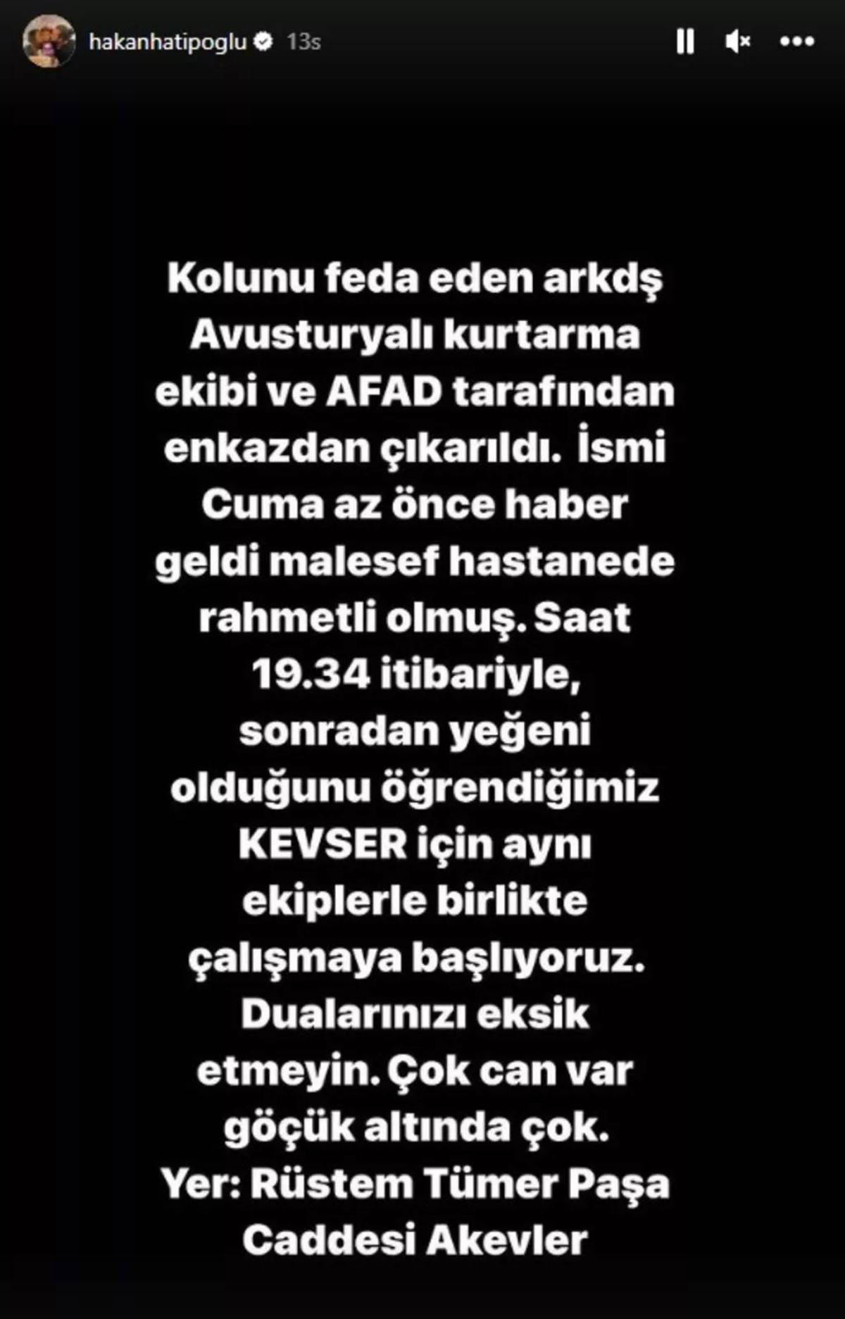 Hatipoğlu, yaptığı paylaşımda “Kolunu feda eden arkadaş Avusturyalı kurtarma ekibi ve AFAD tarafından enkazdan çıkarıldı. İsmi Cuma az önce haber geldi maalesef hastanede rahmetli olmuş. Saat 19.34 itibarıyla, sonradan yeğeni olduğunu öğrendiğimiz Kevser için aynı ekiplerle birlikte çalışmaya başlıyoruz. Dualarınızı eksik etmeyin. Çok can var göçük altında çok. Yer: Rüstem Tümer Paşa Caddesi Akevler” ifadelerini kullandı.