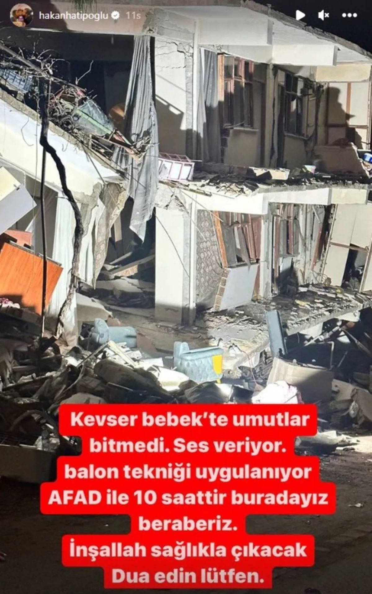 Hatipoğlu bir sonraki paylaşımında ise "Kevser bebekte umutlar bitmedi. Ses veriyor. Balon tekniği uygulanıyor. AFAD ile 10 saattir buradayız, beraberiz. İnşallah sağlıkla çıkacak. Dua edin" dedi.
