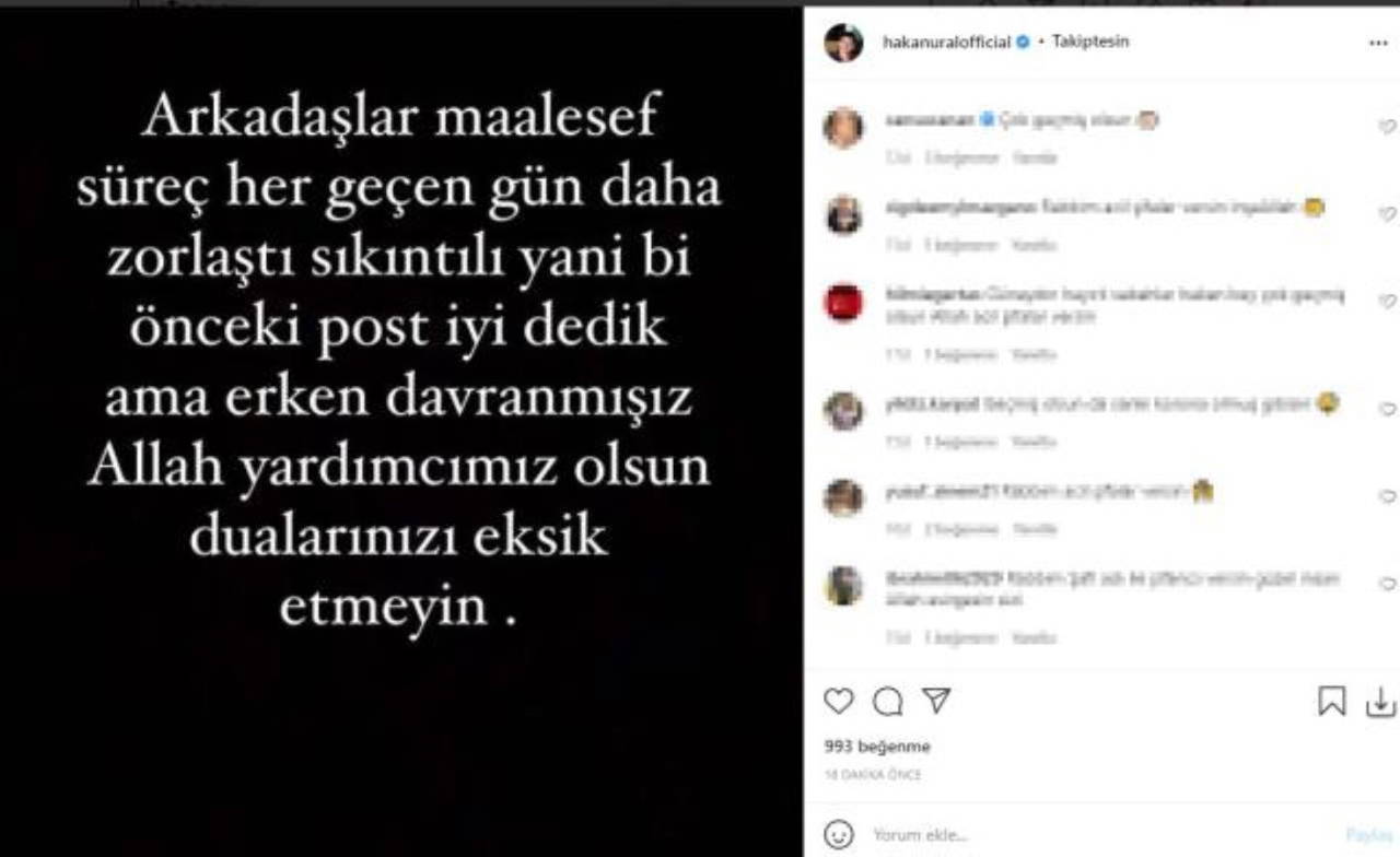 Ancak durumu ağırlaşan ünlü isimden yeni bir paylaşım geldi. Ural, "Arkadaşlar maalesef süreç her geçen gün daha zorlaştı. Sıkıntılı yani. Bir önceki post iyi dedik ama erken davranmışız. Allah yardımcımız olsun dualarınızı eksik etmeyin" ifadelerini kullandı.