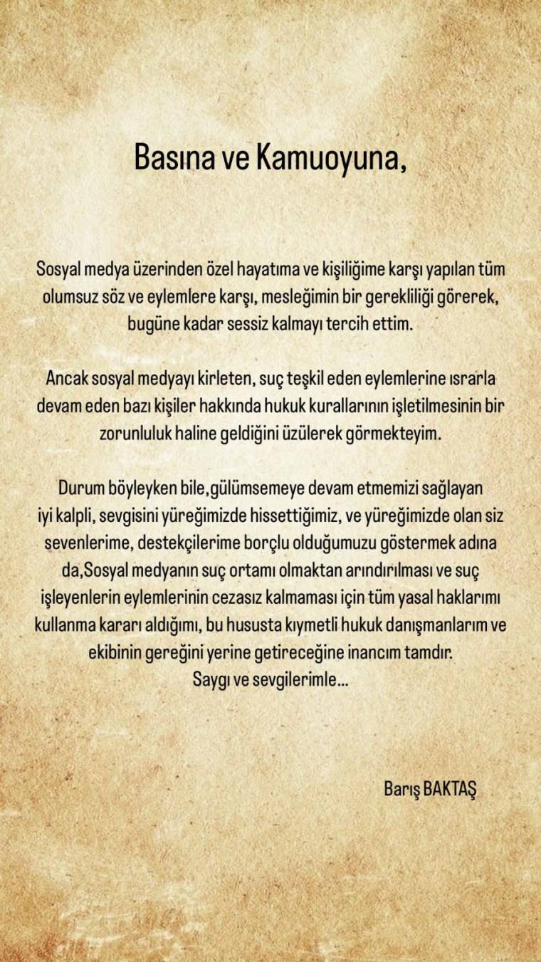 Durum böyle iken bile gülümsemeye devam etmemizi sağlayan iyi kalpli, sevgisini yüreğimizde hissettiğimiz ve yüreğimizde olan siz sevenlerime, destekçilerime borçlu olduğumu göstermek adına da sosyal medyanın suç ortamı olmaktan arındırılması ve suç işleyenlerin eylemlerinin cezasız kalmaması için tüm yasal haklarımı kullanma kararı aldığımı, bu hususta kıymetli hukuk danışmanların ve ekibinin gereğini yerine getireceğine inancım sonsuzdur. Saygı ve sevgilerimle…"