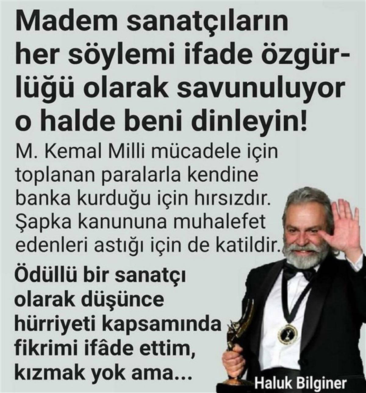"Madem sanatçıların her söylemi ifade özgürlüğü olarak savunuluyor o halde beni dinleyin. M. Kemal milli mücadele için toplanan paralarla kendine banka kurduğu için hırsızdır. Şapka kanununa muhalefet edenleri astığı için de katildir. Ödüllü bir sanatçı olarak düşünce hürriyeti kapsamında fikrimi ifade ettim, kızmak yok ama."