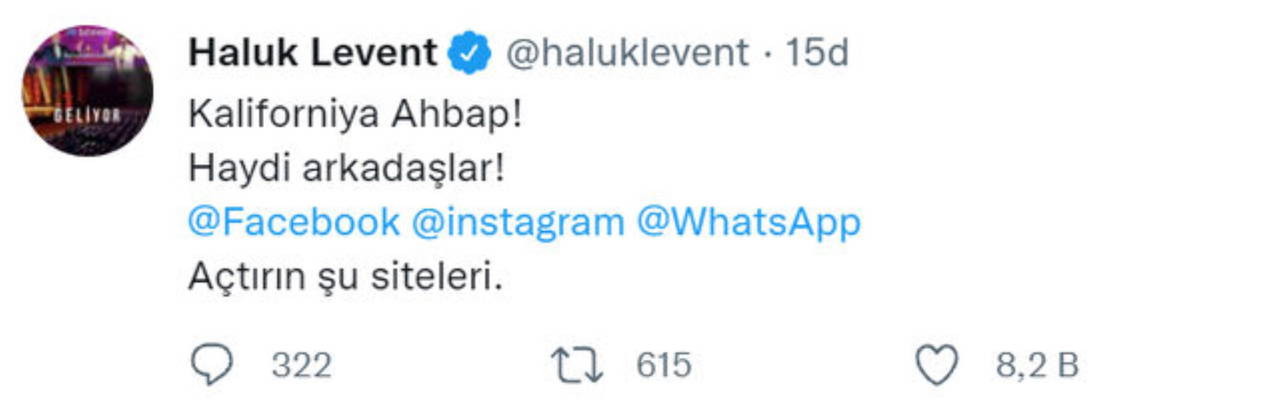 Ünlü sanatçı paylaşımında "Kaliforniya Ahbap! Haydi arkadaşlar! Facebook, Instagram, WhatsApp. Açtırın şu siteleri" notunu yazdı.