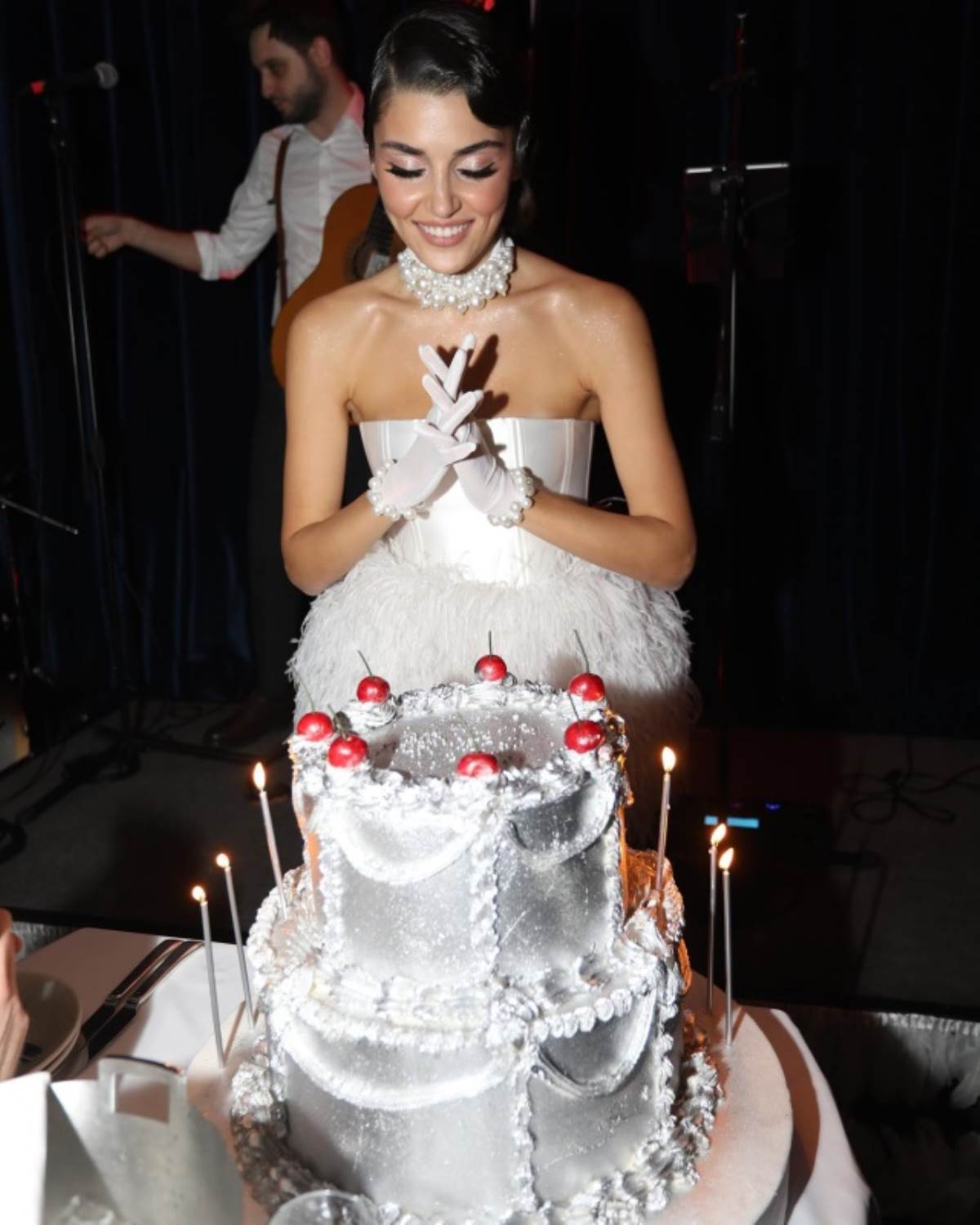 dikkat çekerken gümüş renkli pastası da dikkat çekti. Güzel oyuncu, gece