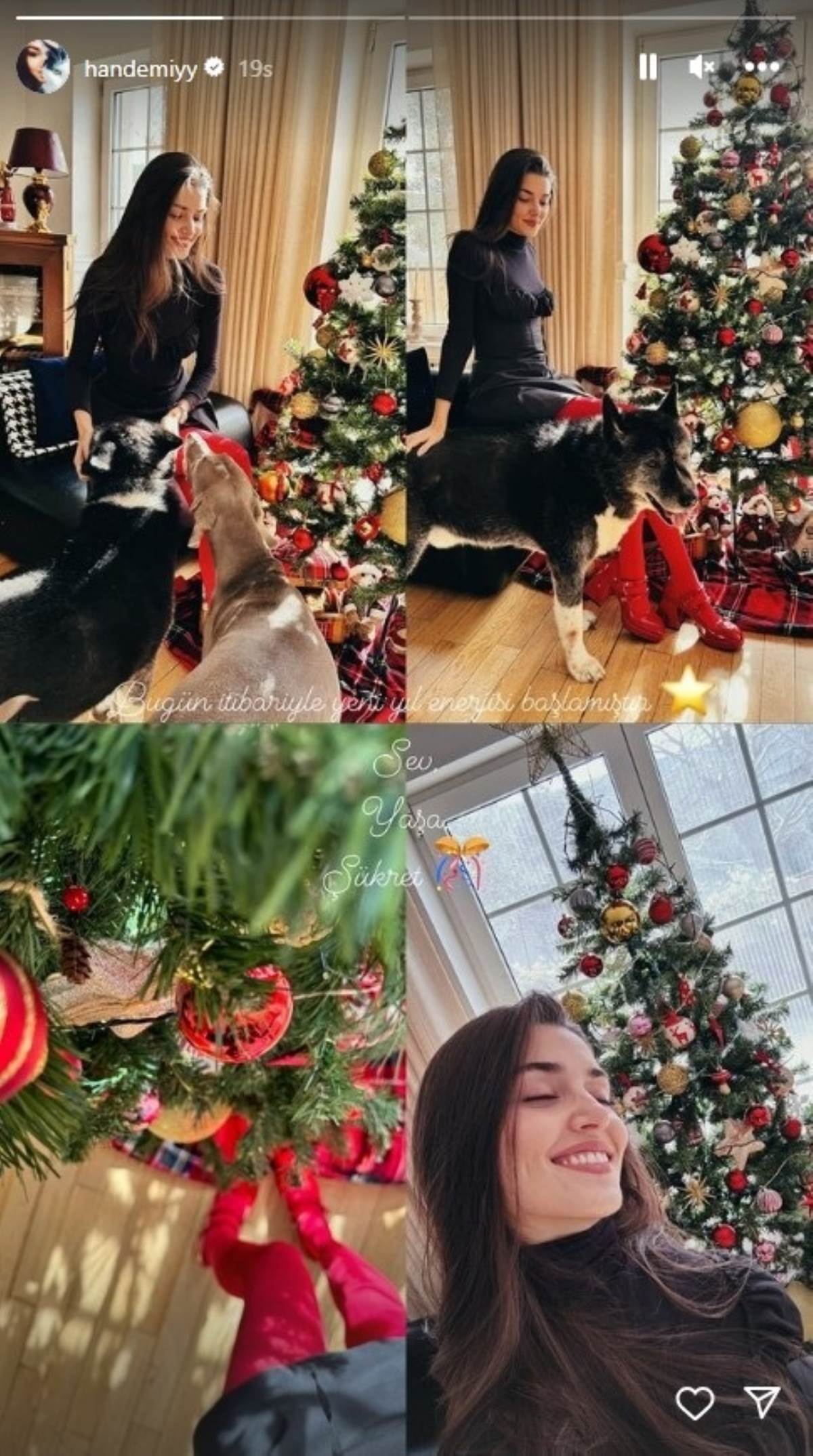 sonra da yılbaşı ağacının önünde köpekleri pozlar vererek "Bugün itibariyle