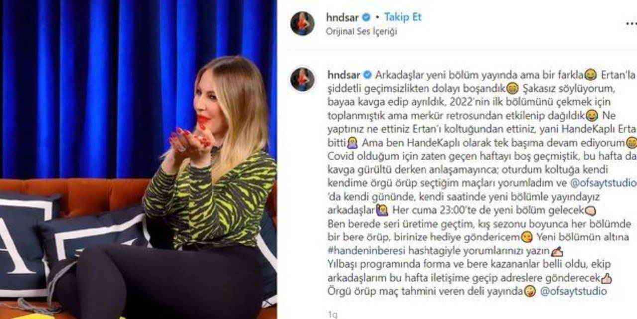 "Arkadaşlar yeni bölüm yayında ama bir farkla. Ertan’la şiddetli geçimsizlikten dolayı boşandık. Şakasız söylüyorum, baya kavga edip ayrıldık, 2022’nin ilk bölümünü çekmek için toplanmıştık ama merkür retrosundan etkilenip dağıldık. Ne yaptınız ne ettiniz Ertan’ı koltuğundan ettiniz, yani HandeKaplı Ertan bitti. Ama ben HandeKaplı olarak tek başıma devam ediyorum.