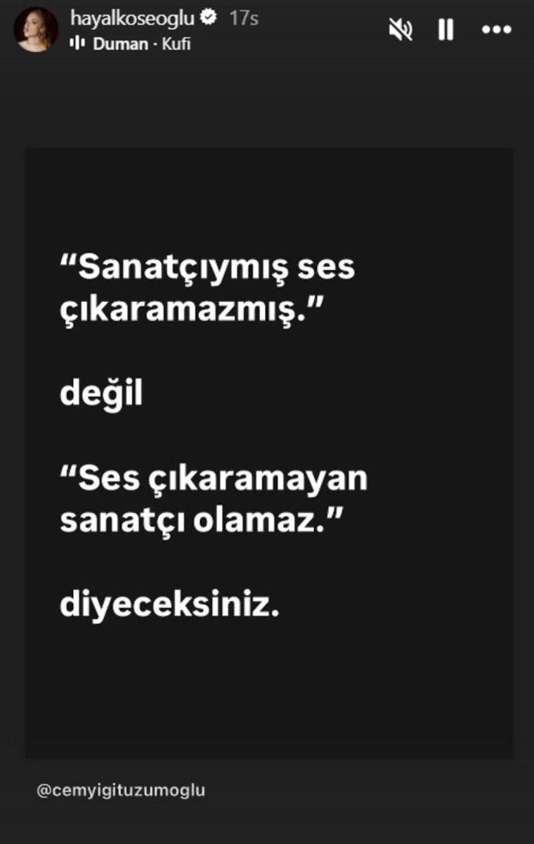Köseoğlu, önce Instagram hesabında "Sanatçıymış, ses çıkaramazmış" değil, "Ses çıkaramayan sanatçı olamaz" diyeceksiniz" ifadelerini kullanarak sanat camiasındaki sessizliği eleştirdi.