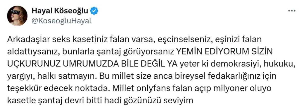 "Arkadaşlar seks kasetiniz falan varsa, eş cinselseniz, eşinizi falan aldattıysanız, bunlarla şantaj görüyorsanız yemin ediyorum sizin uçkurunuz umrumuzda bile değil ya. Yeter ki demokrasiyi, hukuku, yargıyı, halkı satmayın. Bu millet size anca bireysel fedakarlığınız için teşekkür edecek noktada. Millet Onlyfans falan açıp milyoner oluyor, kasetle şantaj devri bitti, hadi gözünüzü seveyim."