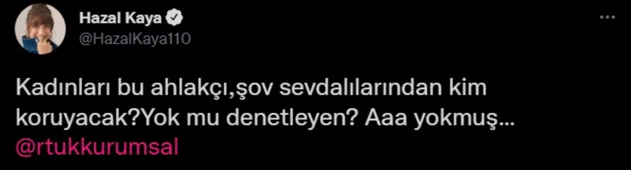 Kaya, bir sonraki paylaşımında ise RTÜK’e seslenerek, “Kadınları bu ahlakçı, şov sevdalılarından kim koruyacak? Yok mu denetleyen? Aaa yokmuş…” sözlerini kullandı.