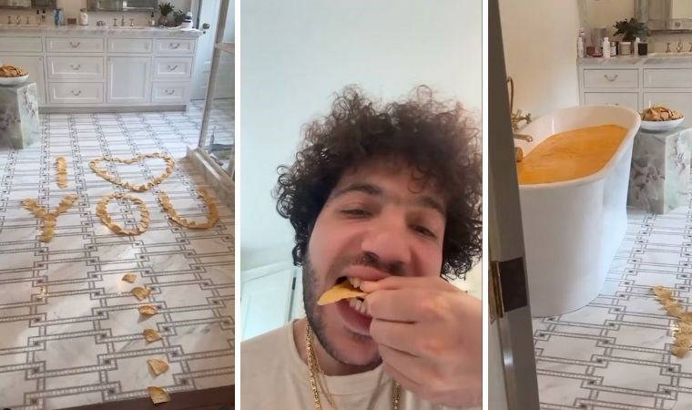 Paylaşımda, tortilla cipslerinden banyoya doğru uzanan bir yol ve küvette "Seni seviyorum" yazısı dikkat çekerken, ağzına kadar sıvı peynirle doldurulmuş küvet dikkat çekti.