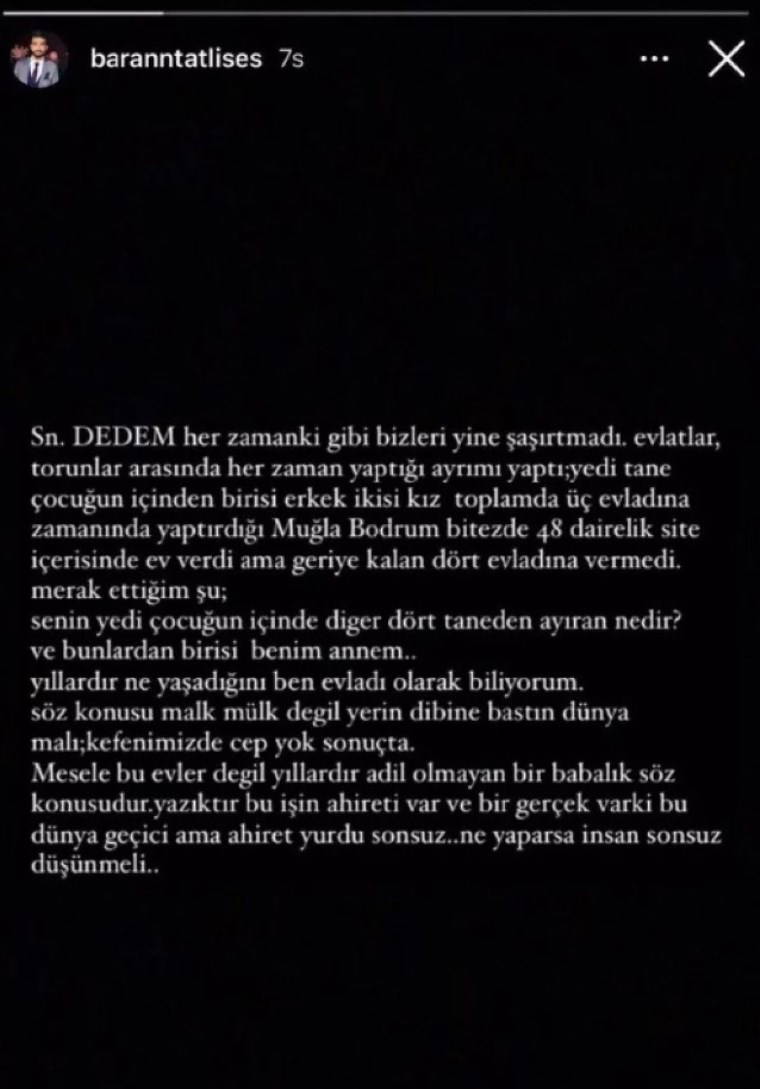İbrahim Tatlıses'in kızı Gülşen'in oğlu Burak Baran, sosyal medyadan isyan etti. Baran, dedesinin, yedi çocuğunun içinden birisi erkek ikisi kız toplamda üç evladına zamanında yaptırdığı Muğla'daki siteden ev verdiğini, kendilerine ise vermediğini söyledi.