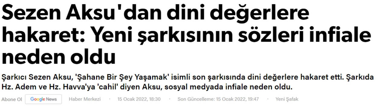 "Sezen Aksu'dan dini değerlere hakaret" başlıklı haberde Aksu'nun yazdığı şarkıda "Binmişiz bir alâmate. Gidiyoruz kıyamete. Selam söyleyin o cahil Havva ile Adem’e..." sözlerini dine hakaret olarak yorumladı. Haberin ardından sosyal medyada troller tarafından #sezenaksuhaddinibil hashtagi açıldı.