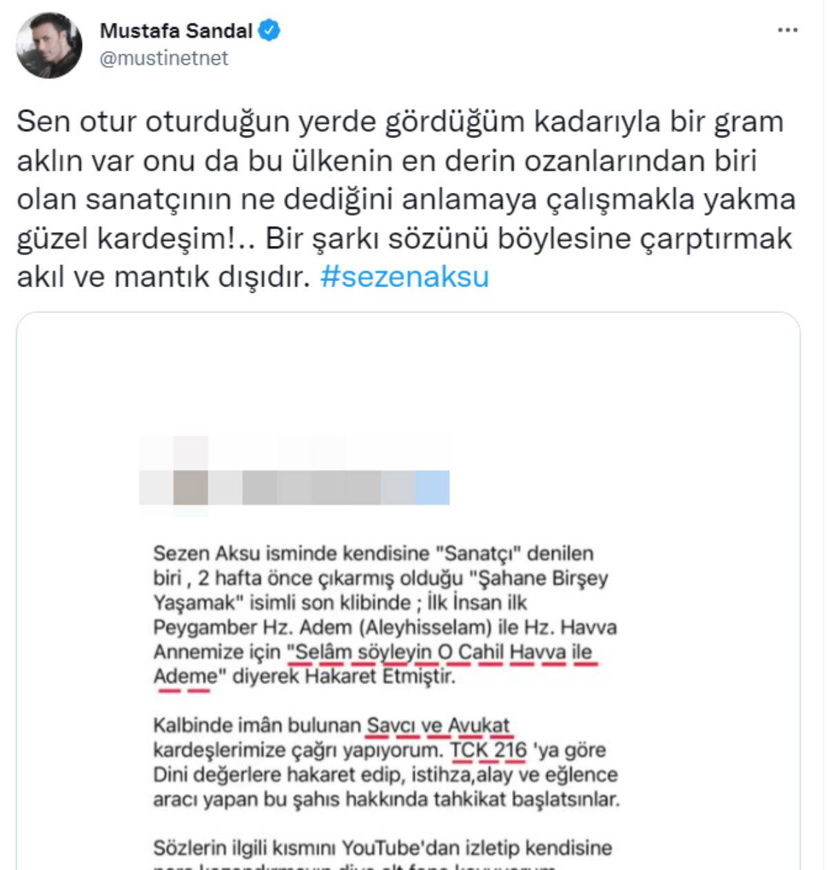 Pek çok ünlü isim, şarkısı üzerinden hedef gösterilen Sezen Aksu’ya destek verirken; şarkıcı Mustafa Sandal da, Aksu'yu eleştirenlere Twitter'dan tepki gösterdi.
