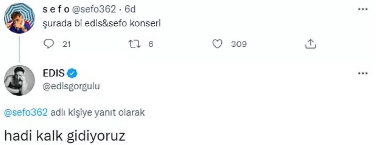 Ardından Sefo'nun "Şurada bir Edis&Sefo konseri" yorumuna meslektaşı Edis Görgülü de 'Hadi kalk gidiyoruz' şeklinde karşılık verdi.