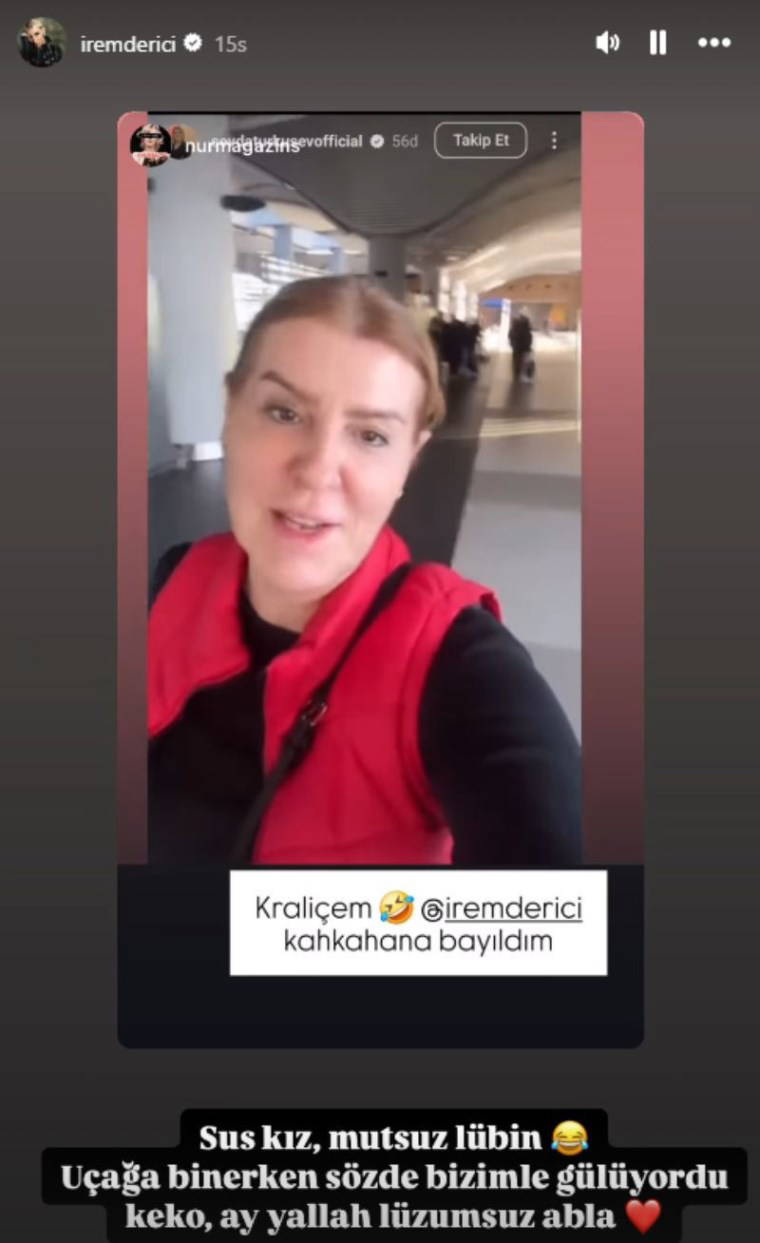 Sevda Türküsev'in eleştirilerine sosyal medya paylaşımıyla karşılık veren İrem Derici, "Sus kız mutsuz lübin! Uçağa binerken sözde bizimle gülüyordu, keko. Hay Allah, lüzumsuz abla" mesajını yazdı.