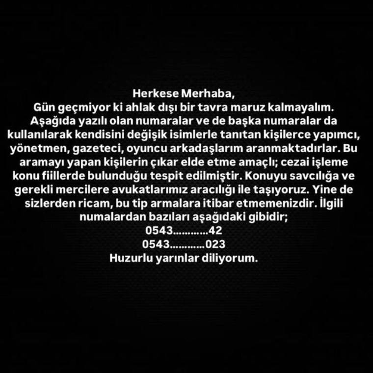 “Herkese merhaba... Gün geçmiyor ki ahlak dışı bir tavra maruz kalmayalım. Aşağıda yazılı olan numaralar ve de başka numaralar da kullanılarak kendisini değişik isimlerle tanıtan kişilerce yapımcı, yönetmen, gazeteci, oyuncu arkadaşlarım aranmaktadır. Bu aramayı yapan kişilerin çıkar elde etme amaçlı cezai işleme konu fiillerde bulunduğu tespit edilmiştir. Konuyu savcılığa ve gerekli mercilere avukatlarımız aracılığıyla taşıyoruz. Yine de sizlerden ricam, bu tip aramalara itibar etmemenizdir. Huzurlu yarınlar diliyorum.”