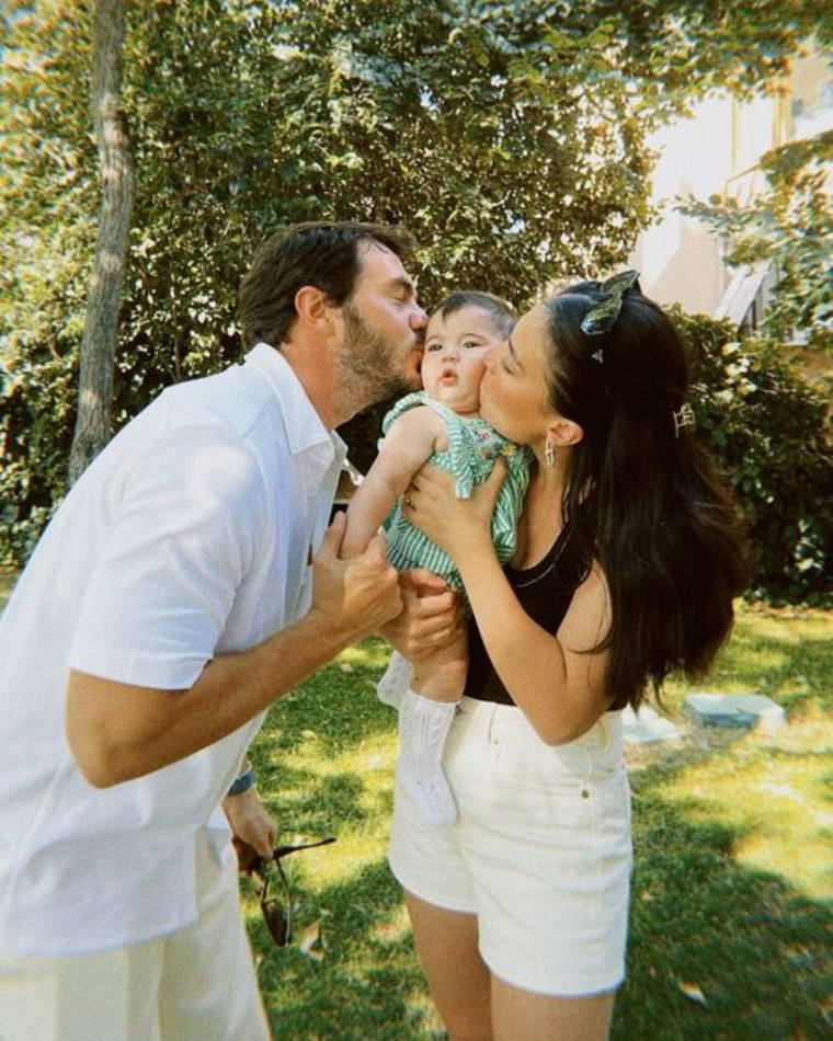 Kızları Azra ile objektif karşısında aile poz veren İsmail Ege Şaşmaz ile Hande Ünal, böylelikle bebeklerinin yüzünü ilk kez göstermiş oldu.