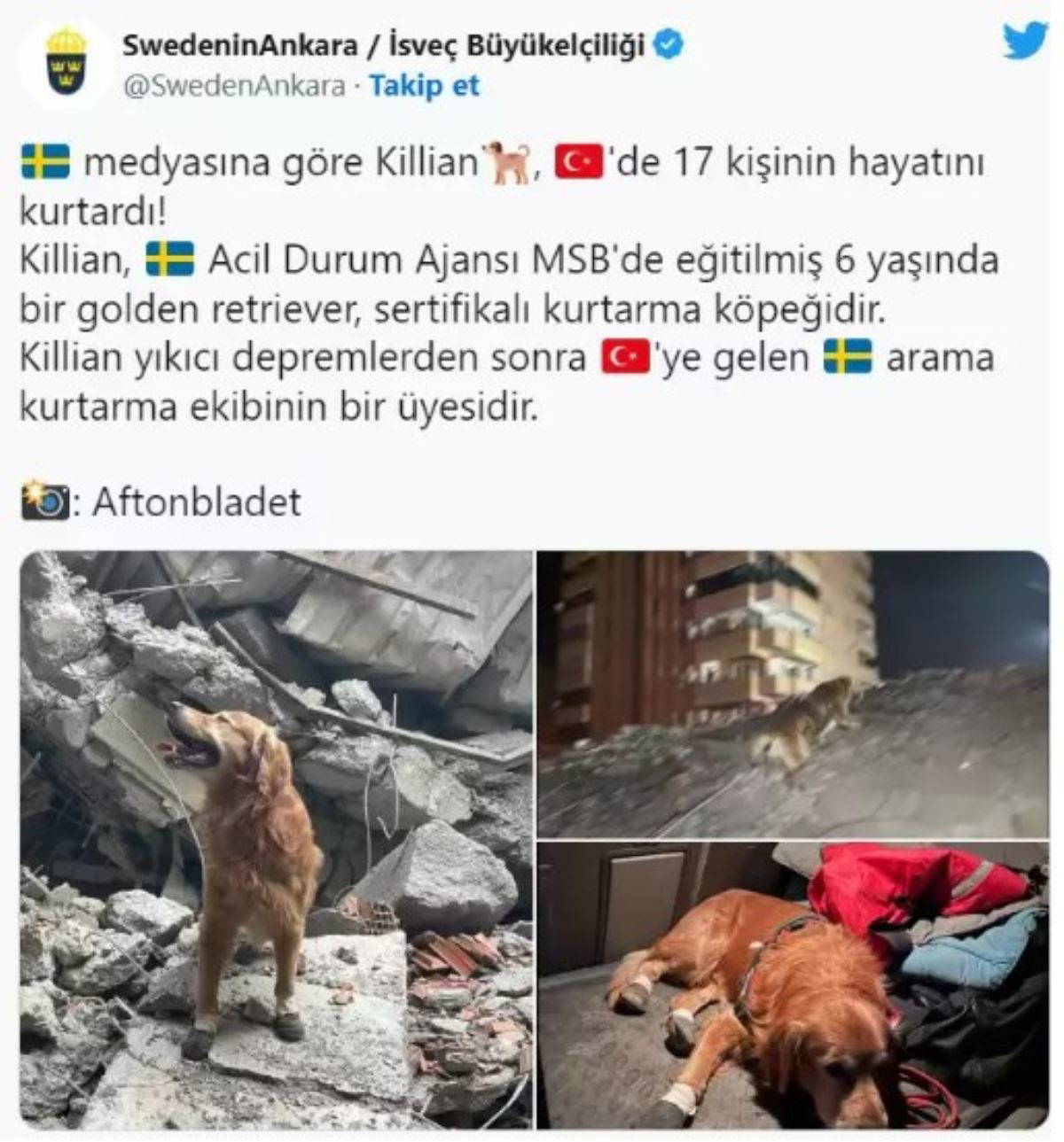 "İsveç medyasına göre Killian, Türkiye'de 17 kişinin hayatını kurtardı! Killian, İsveç Acil Durum Ajansı MSB'de eğitilmiş 6 yaşında bir golden retriever, sertifikalı kurtarma köpeğidir. Killian yıkıcı depremlerden sonra Türkiye'ye gelen arama kurtarma ekibinin bir üyesidir."