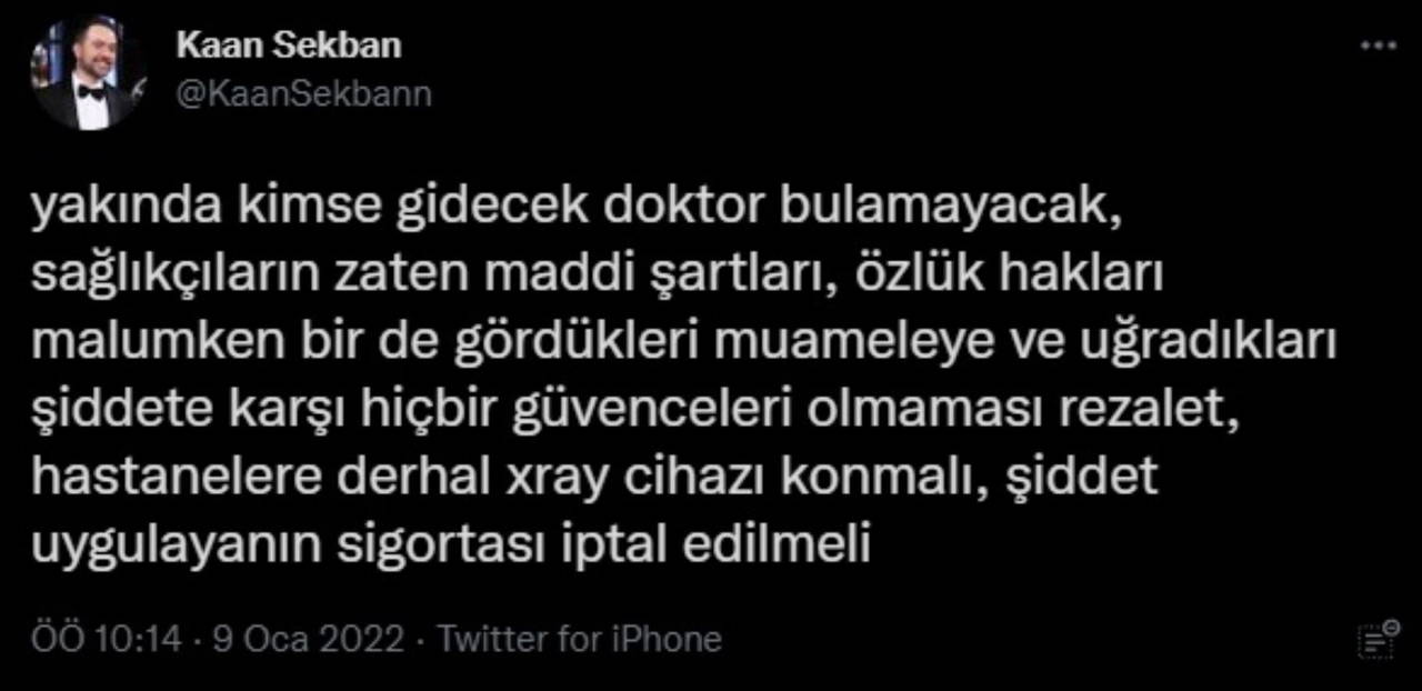 Ünlü komedyen Kaan Sekban da, sağlık emekçilerine yönelik bitmek bilmeyen şiddet olaylarına çok sert tepki gösterdi. Sekban, sosyal medyadan yaptığı paylaşımda, "Hastanelere derhal X-Ray cihazı konulmalı, şiddet uygulayanın sigortası iptal edilmeli" önerisinde bulundu.